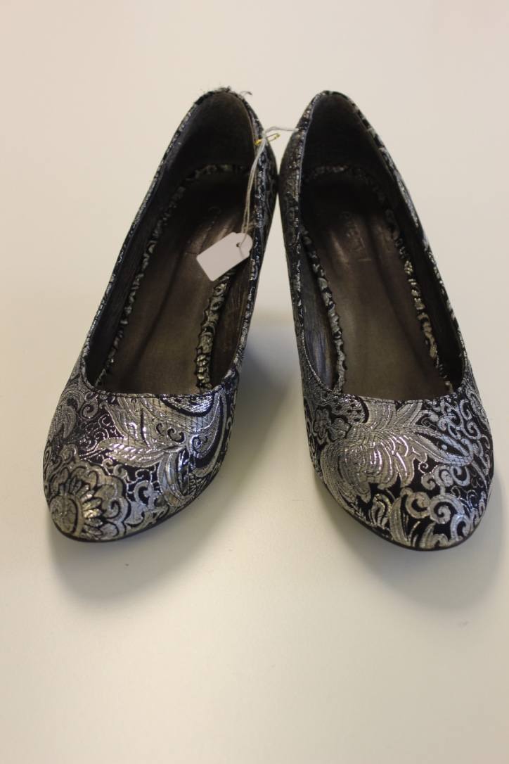 2016009 - Zwart/zilveren pumps van Every1 in maat 40. De binnenkant van de pumps is van kunststof, de buitenkant is van stof.Hakhoogte: 7 cm.