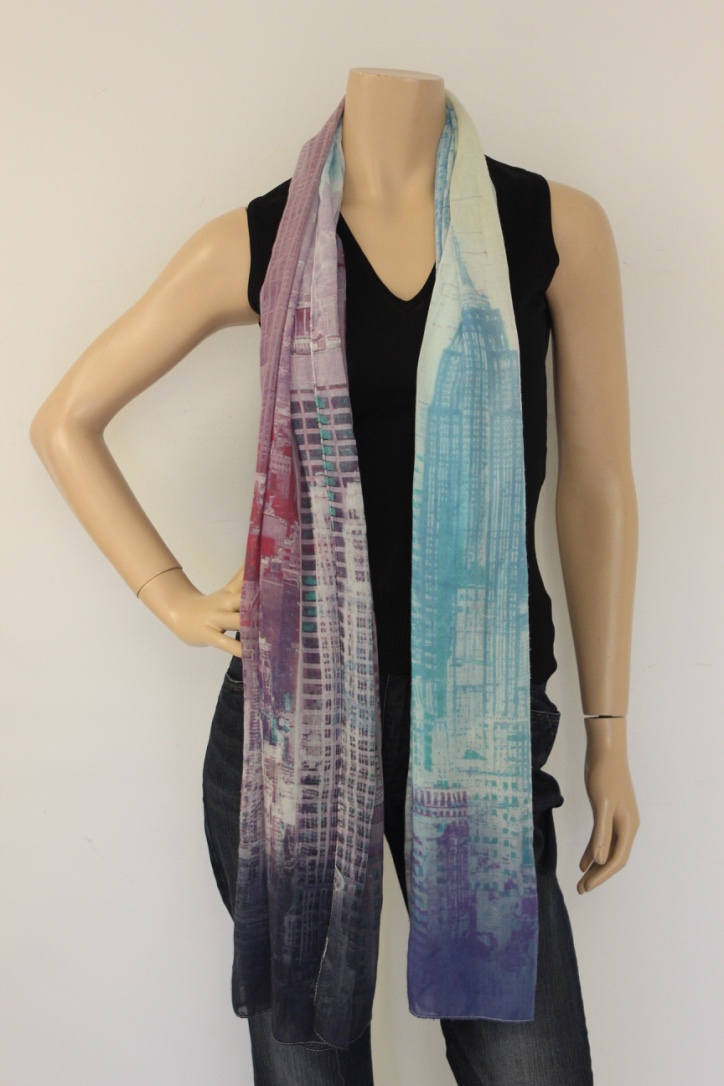 2014002 - Paars/blauwe sjaal. Op de sjaal staat de afbeelding van een stad (maar we hebben geen idee welke stad ;-)).