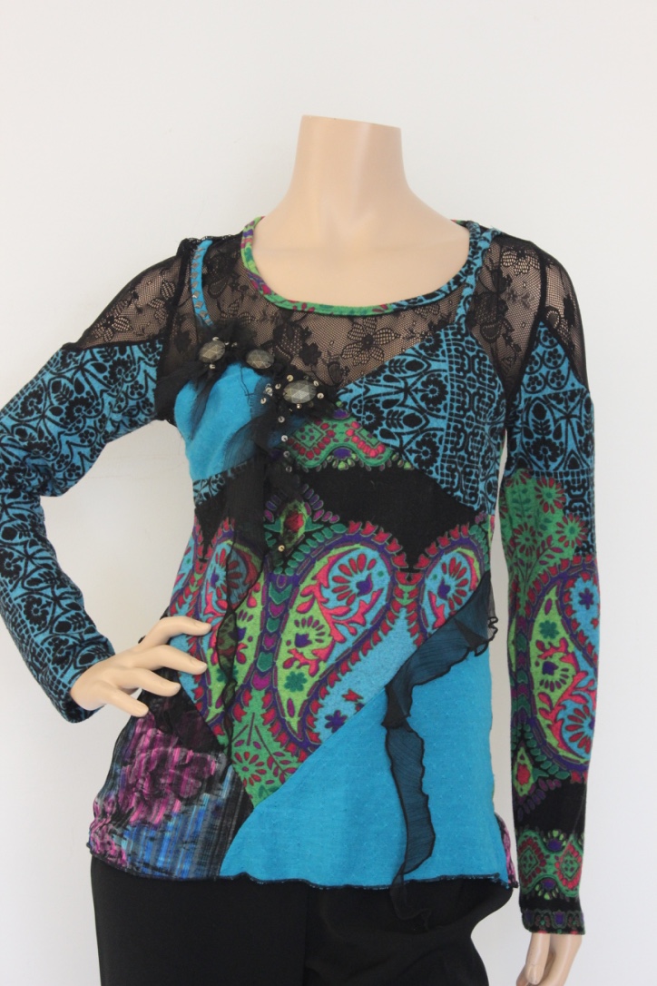 2016006 - Bont t-shirt van Exquiss's in maat 36/38. Het t-shirt is gemaakt van verschillende soorten stof en heeft studs, pailletten en kralen als versiering.