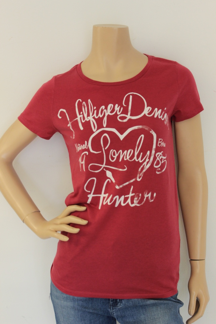 2010005 - Roze t-shirt van Tommy Hilfiger met witte tekst in maat M (maat 38/maat 40).Stof: 65% polyester, 35% katoen.