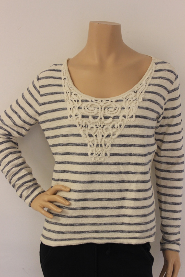 2014001 - Blauw/roomwit truitje van Tramontana in maat M (maat 38/40). De achterkant van het truitje is gemaakt van doorschijnende roomwitte stof.Maten: 38, 40