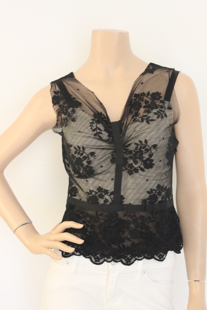 2017002 - Zwart/beige topje van Calvin Klein in maat 36. Het topje is dubbellaags: de onderlaag is beige gestreepte stof en de bovenlaag is zwart kans. De top sluit met een rits aan de zijkant.