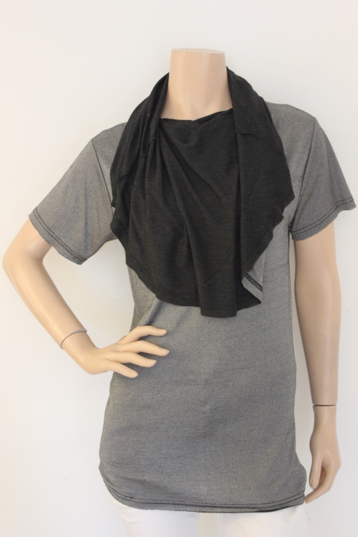 2017002 - Grijs t-shirt van JANBOELO in maat XS (valt als maat 36). Het t-shirt heeft een grote col van dezelfde stof. De stof is zilvergrijs aan de ene kant en antraciet aan de andere kant.