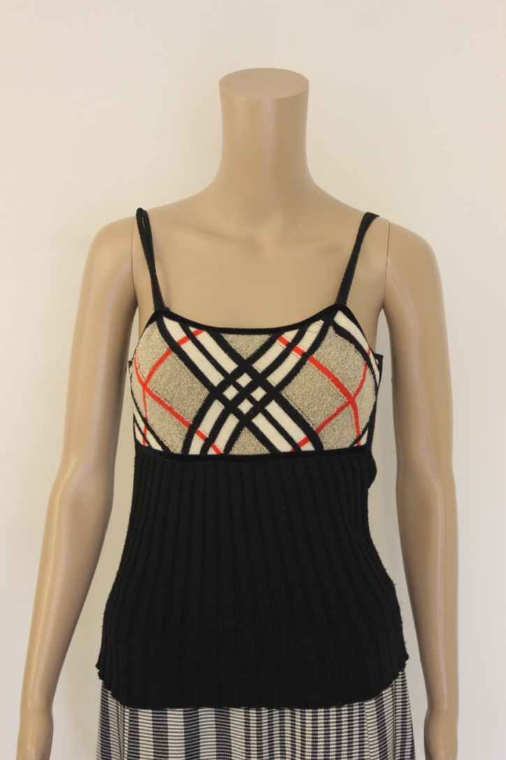 2017001 - Zwarte top van Marc Cain in maat N2 (maat 38) met de bekende 'Burberry ruit'. De top heeft verstelbare elastische bandjes. De top is ook te koop in combinatie met een vestje. Zoek op de zoekmachine naar Marc Cain om de twinset te vinden.Stof 1: 90% wol, 10% nylon.