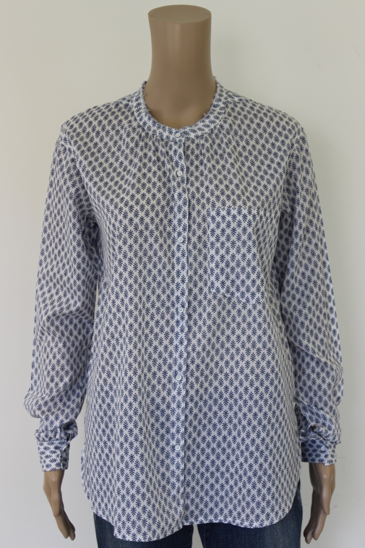 2011010 - Blauw/witte blouse van Maison Scotch (Scotch & Soda) in maat 2 (maat 38). De bovenrand is gerafeld. Stof: 100% katoen.