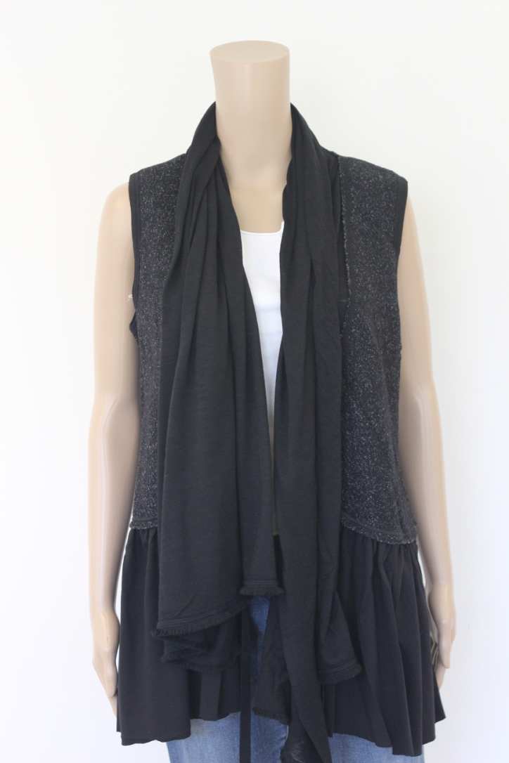 2010013 - Zwart giletvest van High in maat 42. Het vest is gemaakt van meerdere soorten stof: gladde zwarte stof aan de boorden over het voorpand, zwart/wit gemêleerde stof op het voor- en achterpand en leatherlook stof in een keu aan de achterkant met een stukje lint met blingbling versieringen erop. Het vest kan dicht geknoopt worden met een koordje.