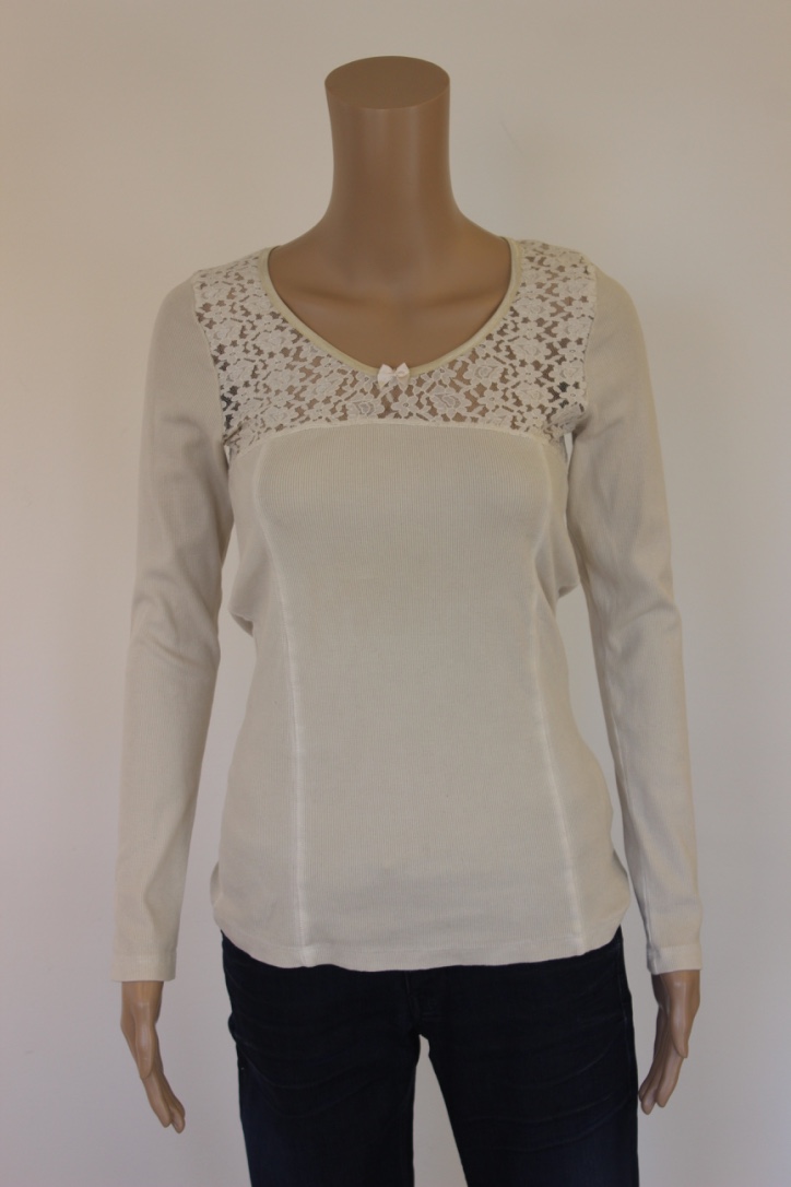 2013006 - Amor Lola beige t-shirt in maat M (maat 38). Het kanten gedeelte van het t-shirt is doorschijnend.Stof: 97% katoen, 3% elasthaan.