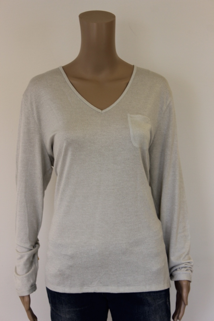 2016001 - Zilvergrijze trui van L.O.E.S. in maat XL (maat 42/44). In de stof is een zilverdraadje geweven. De trui is ook te koop in combinatie met een sjaal. Zie de rubriek "pakken & ensembles".