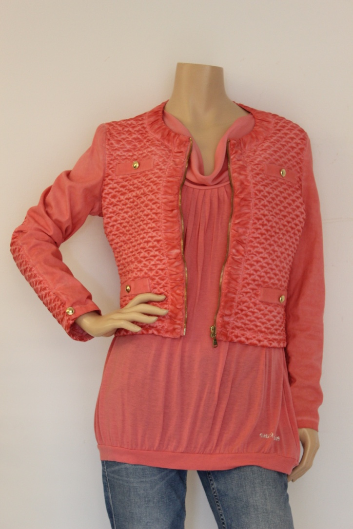 2014002 - Set van zalmroze top (38/40) en jasje (40). De top heeft een lage rug (net boven de BH band) en sluit met een extra koordje in de nek.