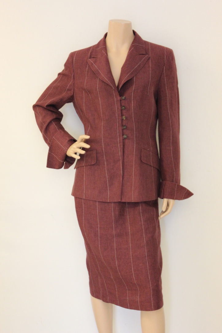 2010020 - Bordeaux linnen krijtstreep pakje van MARK in maat 42. Het jasje is geheel gevoerd, sluit met knoopjes aan de voorzijde en heeft twee zakjes voor (zitten nog dicht genaaid).