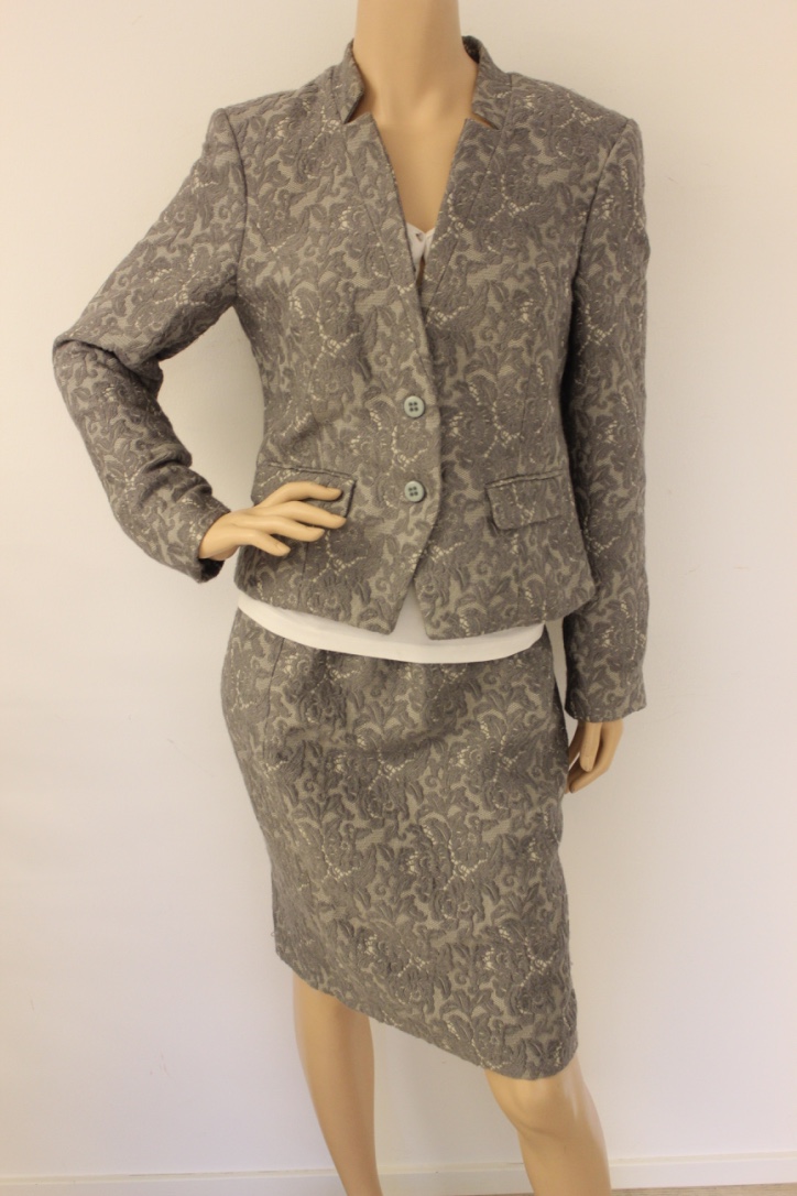 2010020 - Grijs pakje van Stroke in maat 42. De rok sluit met een rits en een knoopje aan de achterkant en is geheel gevoerd.