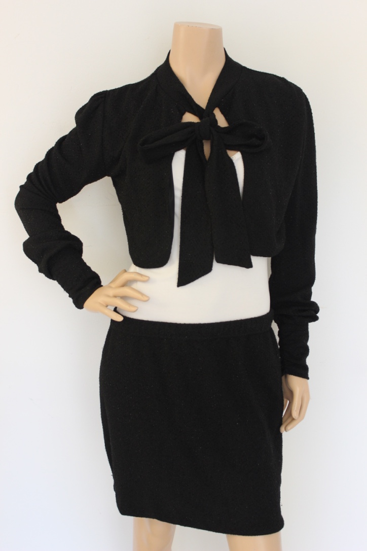 2010005 - Zwart glinsterpakje van Juffrouw Jansen in maat 38/40 (bolero-vestje) en maat 40/42 (rokje). In de stof is glinsterdraad gestikt, waardoor het pakje een glinstereffect heeft. Het rokje en het vestje zijn ook los te koop (zie 'rokken en jurken' en 'blouse en truitjes')