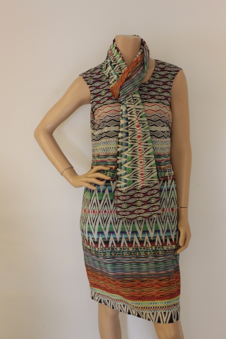 2012013 - Bonte zomerjurk en sjaal van Stroke in maat 40. De jurk is geheel gevoerd en sluit met een rits aan de zijkant. Op het bovenstuk zitten kleine bling bling steentjes. De jurk en de sjaal zijn ook los te koop. Zie "jurken en rokken" en "accessoires"
