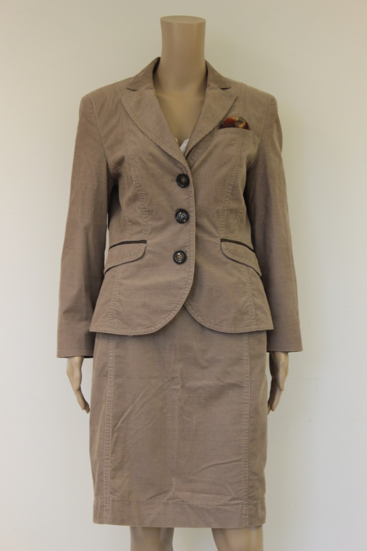 2012013 - Lichtbruin rokje en jasje van een fijne ribstof van Gerry Weber in maat 40. Het jasje is geheel gevoerd en heeft twee insteekzakjes voor. Het rokje sluit met een rits aan de achterkant en is geheel gevoerd. Het rokje en het jasje zijn ook los te koop. Zoek via de zoekmachine op Gerry Weber.Stof: 97% katoen, 3% elasthaan.