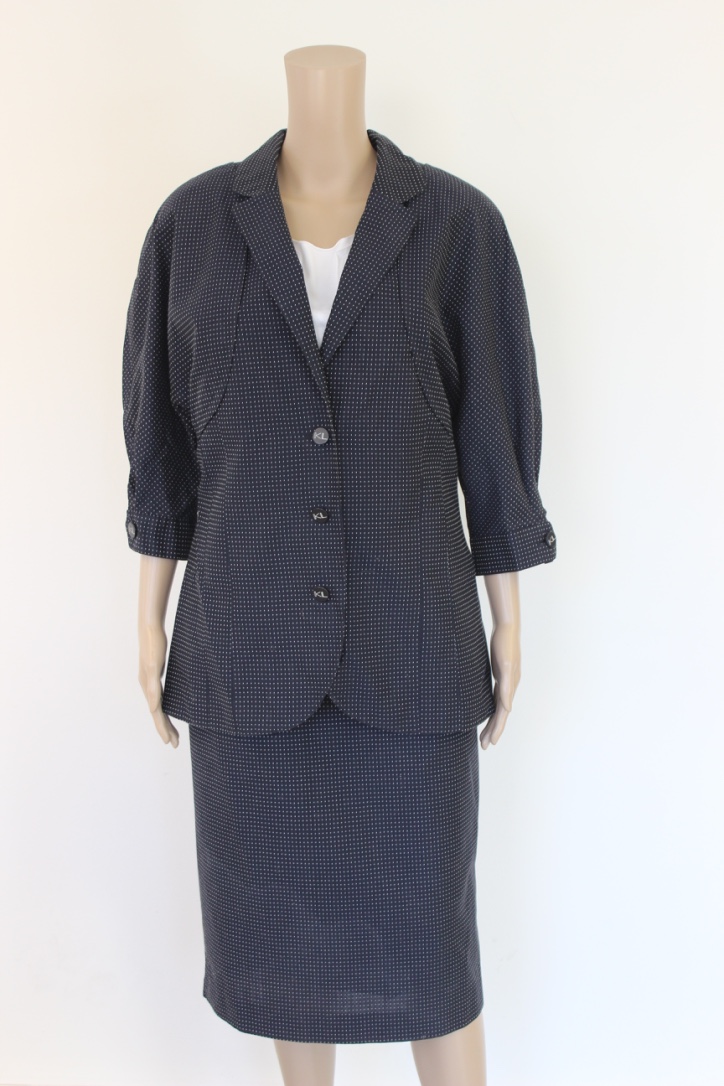 2011008 - Blauw pakje van Karl Lagerfeld met witte stippen in maat 42.De rok sluit met een rits en knoopjes aan de achterkant en er kan een riem om de rok gedragen worden. De rok is geheel gevoerd.
